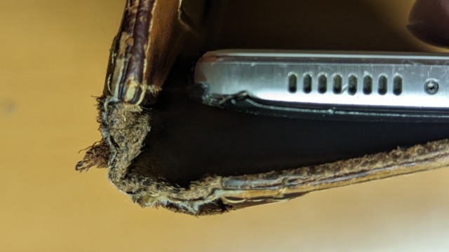 このようになると表と裏の革および芯材が剥がれてきます。