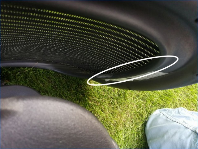 写真は座面クッションを下側からのぞいたところ。写真の下側(芝接触している面)が座面の先端。