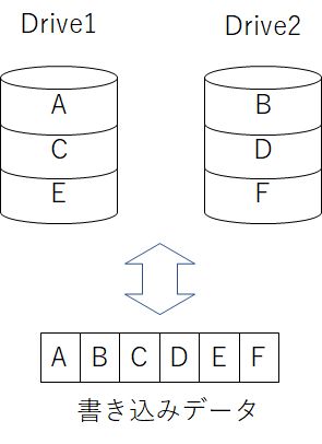 ドライブの台数を増やすほど速度は向上しますが障害に対する耐性は無く、1台のドライブ故障ですべてのデータが消失します