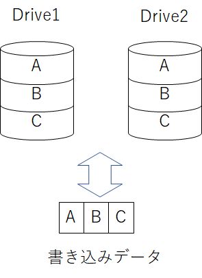 同じデータを2台のドライブに書き込む事で障害に対する耐性を高めた仕組みです。