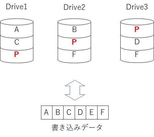 誤り訂正符号(パリティ)を書き込むことで1台のドライブが故障しても復旧する事が出来ます。