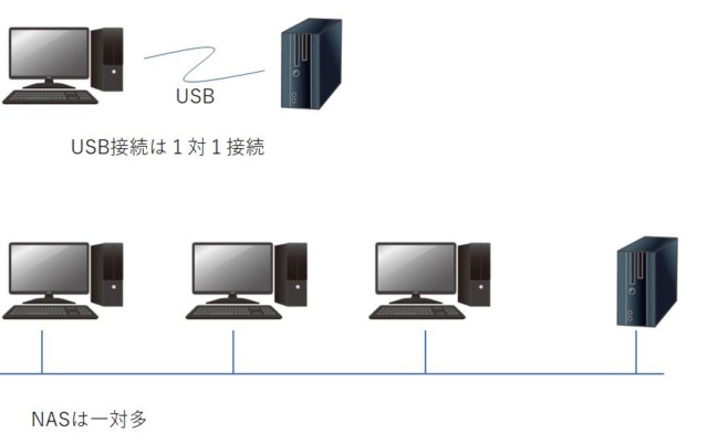 一般的な外付けハードディスクはUSBで特定のPCに接続する為、接続したPCからしか利用する事はできません。