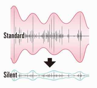 図の波形データは、標準仕様及び静音仕様のキーボードについて同一の被験者による打鍵録音データから、人間の聴覚感度が高い周波数成分である2,500〜5,000Hzを抽出した一例です。標準仕様キーボードに比べ、静音仕様キーボードの振幅(縦軸方向)が大きく下がっており、耳への刺激が少ないことがわかります。