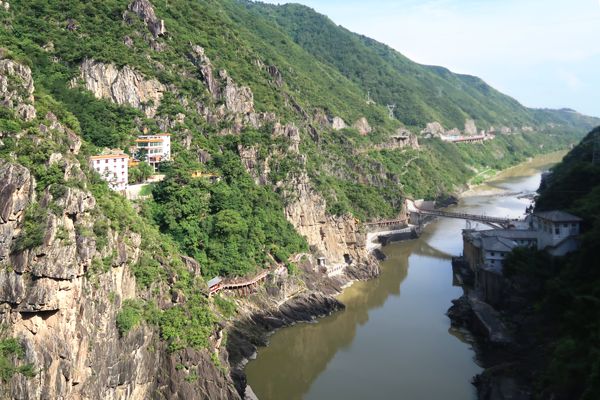 褒河渓谷です。川に沿って復元された桟道も見えます。