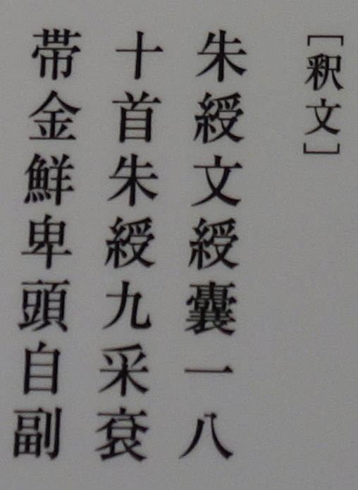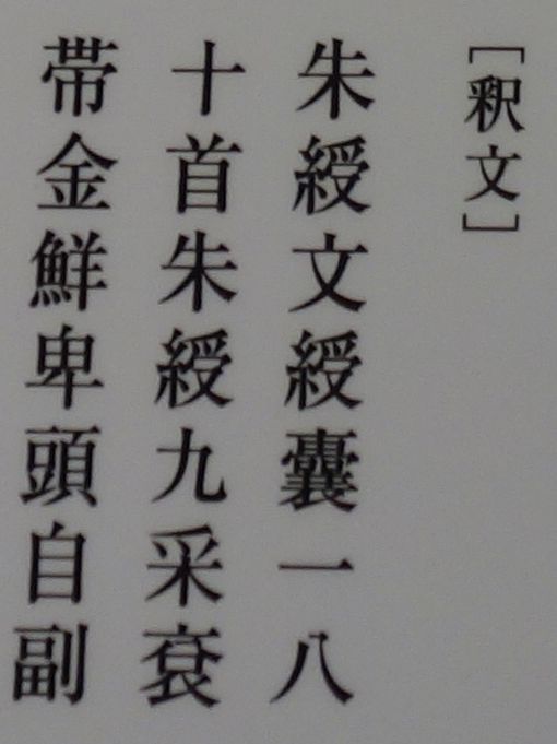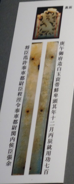 中央の1枚は金の「鮮卑頭」という帯金具の名があり、左の二行銘の石牌には魏志倭人伝にも登場する「縑(かとり)」という絹織物の名がみえる。