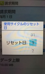 設定→ネットワーク→データ使用量→請求期間と進みリセット日(請求期間開始日)を設定します。